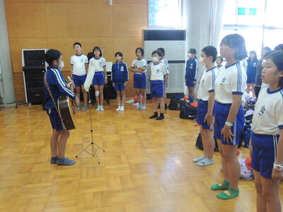 ◆自然の家に戻り「別れの集い」を行いました。自然の家の先生からも、「五小の皆さんのあいさつ、活動・生活の仕方がとても素晴らしかった。」という言葉をいただきました。その後、2日間の貴重な体験を思い出しながら、ピアノとギターの伴奏で「大切なもの」の曲をみんなで歌いました。最後に代表児童が退所のあいさつをし、自然の家を出発しました。