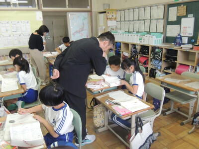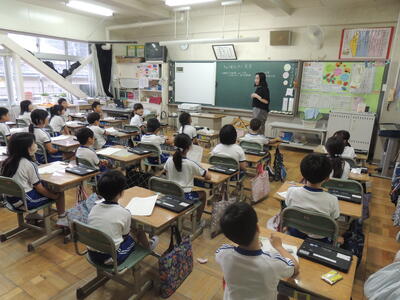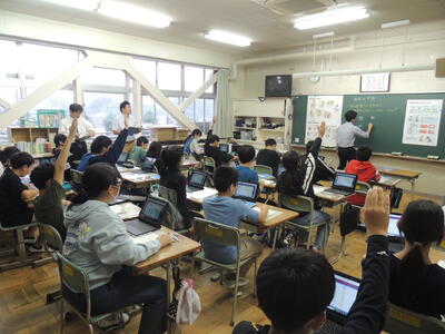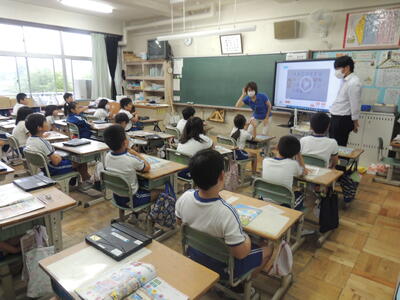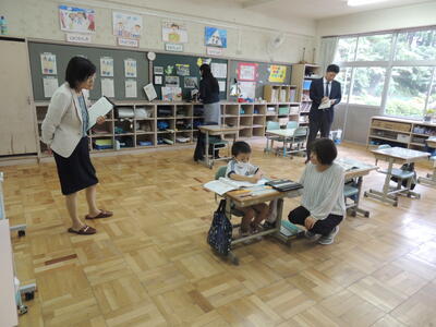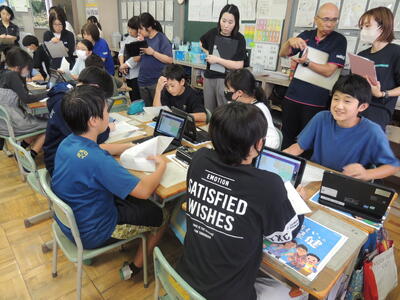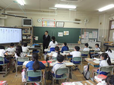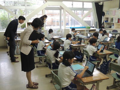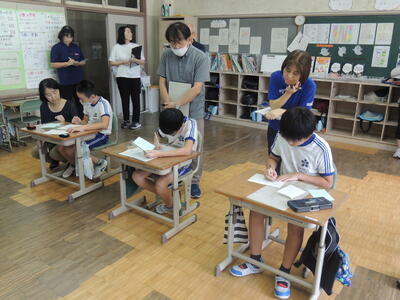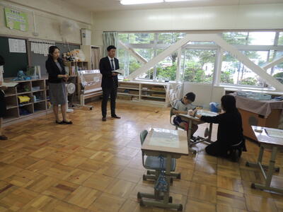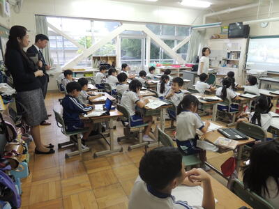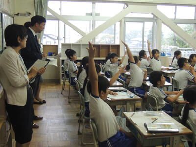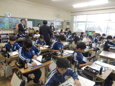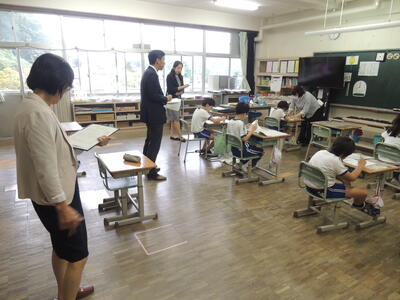 2校時、3校時の各学級での授業の様子を参観していただき、「どの学級もしっかり話を聞き、活発に発表や話し合いをしている。」「授業に対する目の輝きがすばらしい。」「どの学年もICTを効果的に使おうとする姿が見られる。」「どの掲示物も心に花が咲くようで、教室があたたかい。」などの言葉をいただきました。