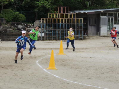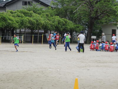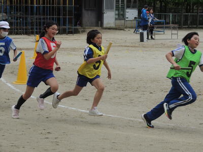 4年生は半周ずつ、5・6年生は1周ずつ走ってのリレーです。