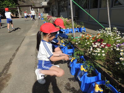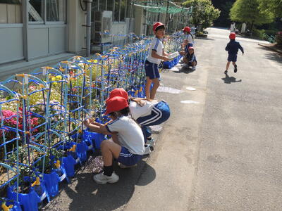 2年生は、先週、生活科の学習で植えた野菜の水かけを行っています。