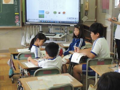 「すがたをかえる大豆」の授業では、文章を読んで大豆がどんな食品に姿を変えていたか見つけ、さらに姿を変えたもので自分が一番驚いた食品とその理由を友達と交流し合うという活動を行いました。友達の考えに「なるほど」や「そうそう」という言葉も聞かれ、お互いの考えを認め合いながら感想を発表し合うことができました。