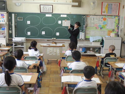 「なかまのことばとかん字」の授業では、カードで出された言葉や漢字を読み合い、それを仲間分けをしてその理由を考えるという授業でした。どんなふうに仲間分けをすればよいか気がつくと、みんな夢中になってワークシートに仲間分けの言葉・漢字を書いていました。友達との話合いも活発に行い、黒板に仲間分けをしたカードを貼る活動では進んで手を挙げて取り組み、言葉の意味によるまとまりを理解することができました。
