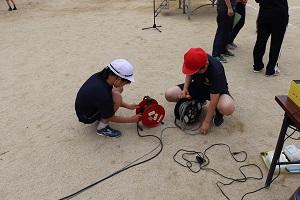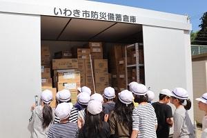 4年生の社会科の学習では、校庭にある防災備蓄倉庫を見学しました。