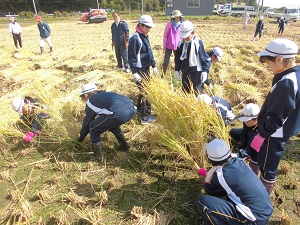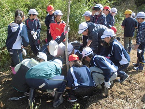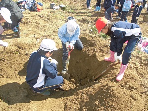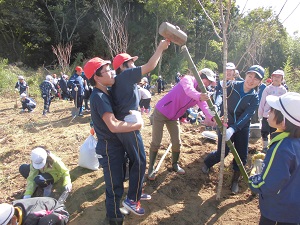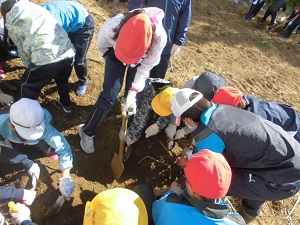みんなで協力して、桜の苗を植える穴を掘ります