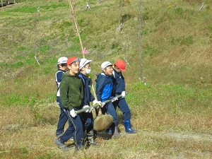 苗を運ぶのは上級生の仕事 下級生が腐葉土を集めました