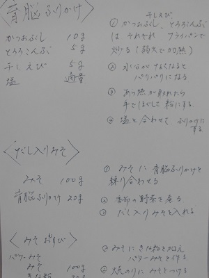 今回つくったのは、育脳ふりかけ、だし入りみそ、みそおむすび。