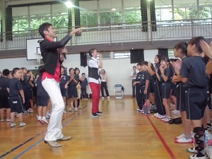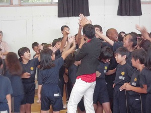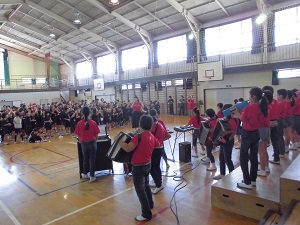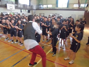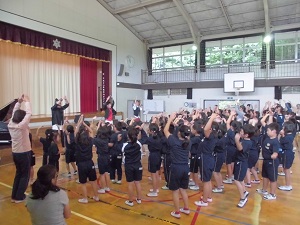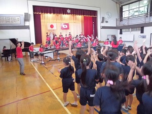 アンコールではみんなで曲にのって、とんだり、歌ったりと学校全体で曲を楽しみました。
