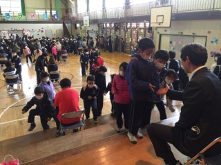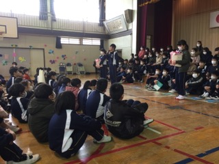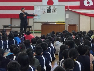 東日本大震災の記憶を忘れないため、全校集会で校長先生の講話を聞きました。写真を見せていただいたり、エピソードを紹介していただきました。