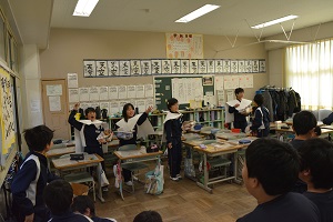 裃を着た5年生が、各学級に行って豆まきをしました。