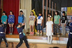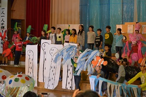 2年生は、野菜栽培や町探検などの学習を劇や身体表現で