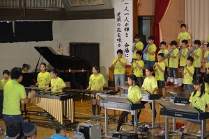 演奏の途中では、各学年代表1名が、打楽器の使い方を