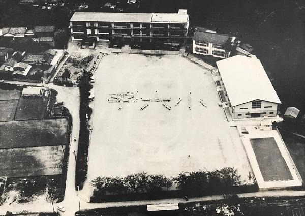 創立100周年を記念して撮影されたものです。本校舎は鉄筋コンクリート造りとなり、プール、体育館も造られています。