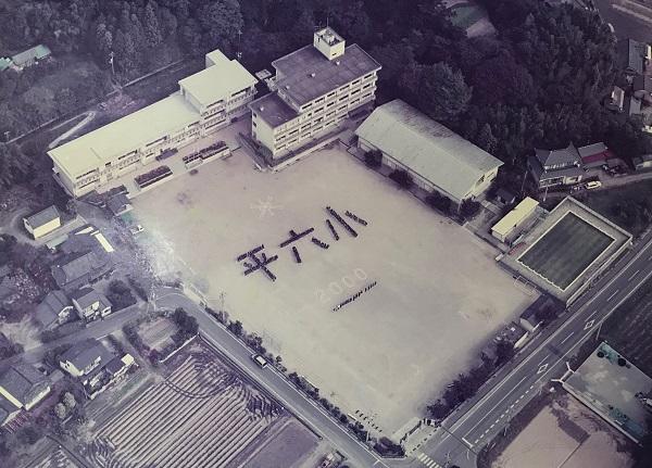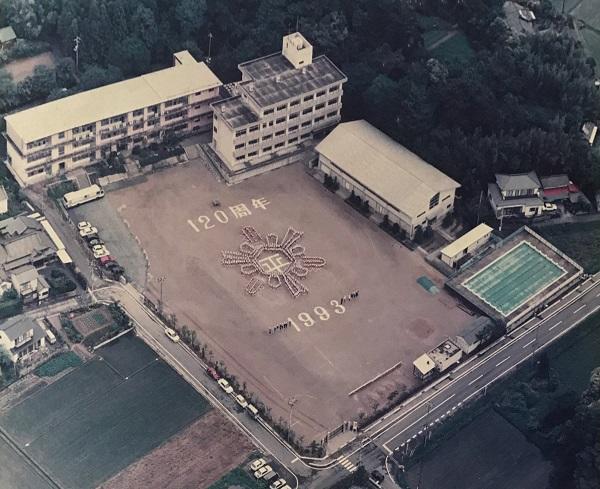 創立120周年を記念して撮影されたものです。東校舎(本校舎右)も鉄筋コンクリートとなり、プールも改築されています。