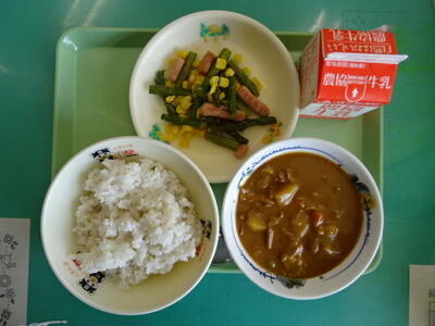 本日の学メニューは、ポークカレーライス、牛乳、アスパラガスとミニウィンナーのソテー でした。