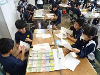 お店に6種類の形の紙がそれぞれ5色ずつあります。それらを自由に組み合わせてカード作りをするために、自分が必要な形と色、その枚数を店員に伝える活動を行っていました。