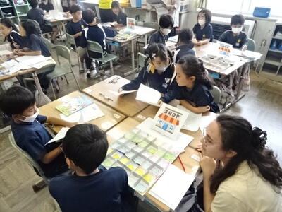 ALTのニーナ先生と英語の学習を楽しく行っています。身の回りの物の色について尋ねたり、答えたりしていました。