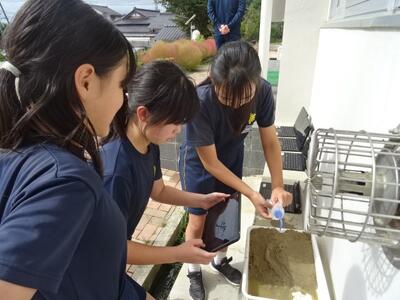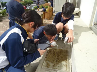 流れる水のはたらきを調べるために、トレイのせた土に水を流していました。また、そのときの様子をじっくりと観察できるよう、動画に収めていました。