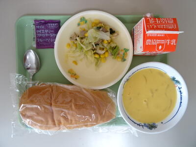 本日のメニューは、コッペパン、ブルーベリージャム、牛乳、キャベツとベーコンのソテー、にんじんポタージュ でした。