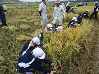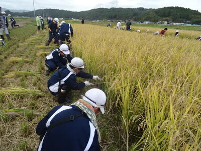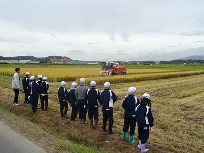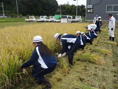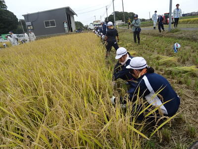 5月に植えた稲の苗が立派に育ち、今日は、稲刈りの体験をさせていただきました。大型の稲刈り機にも載せていただきました。ありがとうございました。