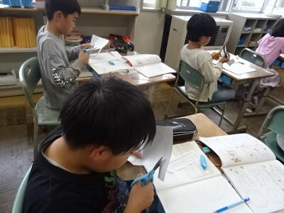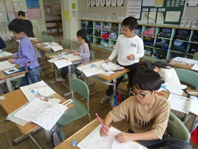 円についての学習が始まりました。教科書についている簡易コンパスを使って、円を描いていました。