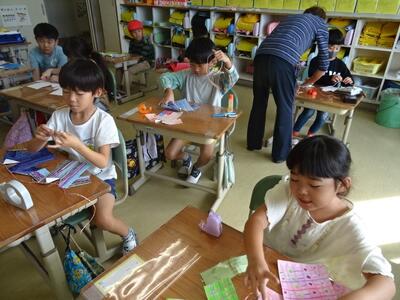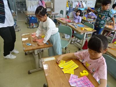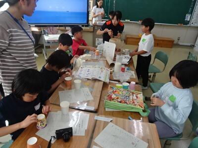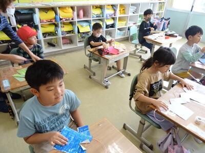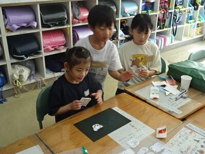 水彩絵の具とクレヨンの特性を生かして彩色する学習をしました。この時間は、自分が彩色して作ったシャツを飾るために、作品の仕上げをしていました。