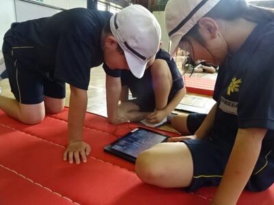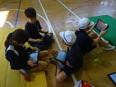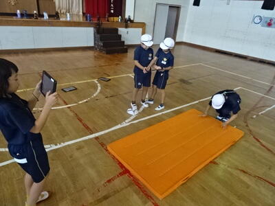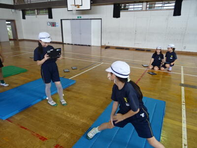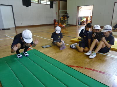 マット運動の学習です。技を行っている様子を動画撮影してもらい、自分の技のできばえをチェックしていました。