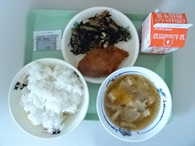 本日のメニューは、ごはん、牛乳、かじきカツ、パックソース、ひじきの油いため、はちはい汁 でした。