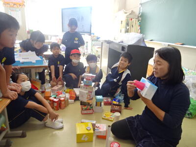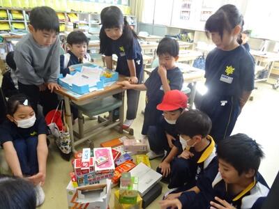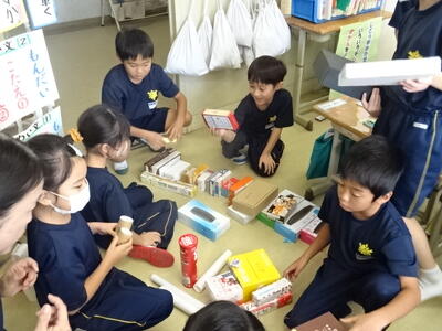 様々な形の空き箱を使って、ボールの形、サイコロの形、筒の形など、仲間分けをしていました。