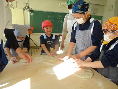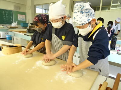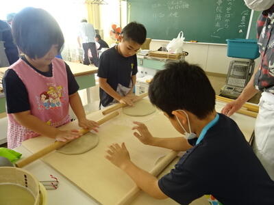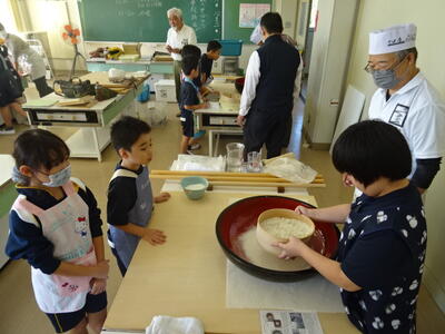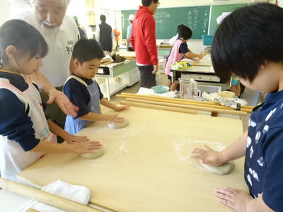 そば打ちの団体「七宝の会」の皆様にお越しいただき、そば打ちの体験を行いました。会の皆様にお手伝いいただきながらも、一からそば打ちを体験し、終始真剣に取り組んでいました。自分でつくったそばはとてもおいしかったようで、このあとは給食の時間なのにもかかわらず、おかわりをしていました。