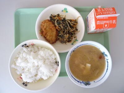 本日のメニューは、ごはん、牛乳、県産ぶたみそカツ、ほうれん草ともやしののりごまあえ、なめことおくいものみそ汁 でした。