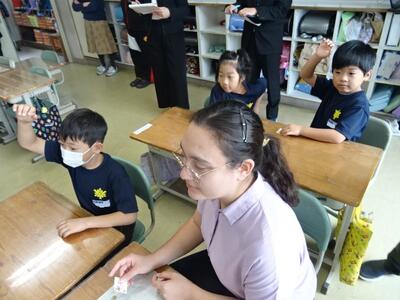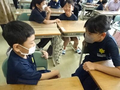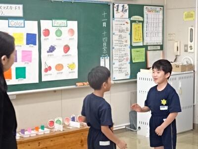 ALTと外国語活動を行っています。好きなもの(動物や色、果物など)の尋ね方や答え方に慣れて、友達と上手に会話することができていました。
