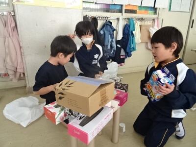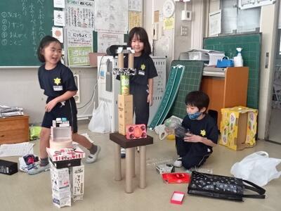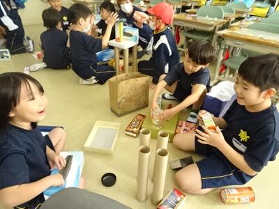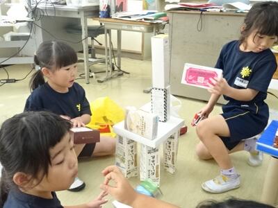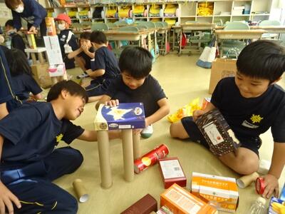 立体図形の学習です。様々な形の空き箱を積んだり重ねたりして、好きな動物をつくっていました。