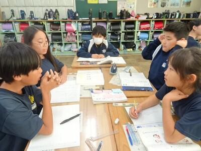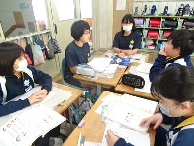 「よりよい学校生活」をテーマに、議題を決めてグループごとに話し合います。司会や記録などの役割を分担して、話し合いを進めていました。
