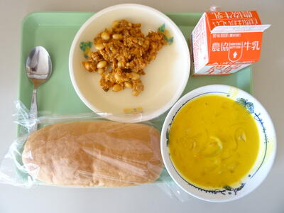 本日のメニューは、コッペパン、牛乳、いわきトマトのチリコンカン、おくいもとかぼちゃのポタージュ でした。
