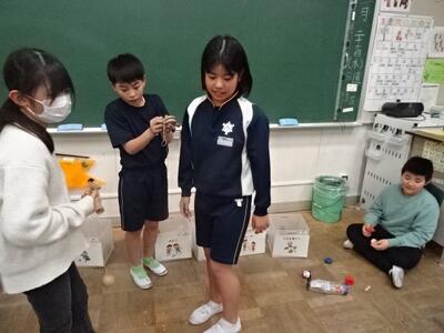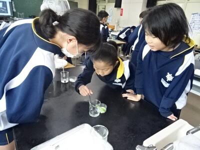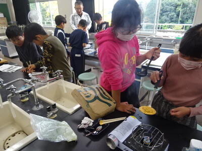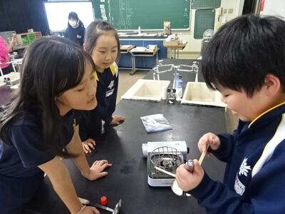 食塩とミョウバンをそれぞれ水に溶かし、物が水に溶ける量は溶ける物によって違うことを確かめていました。