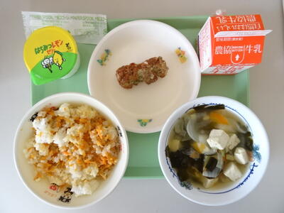 本日のメニューは、ツナごはん、牛乳、ちくわのいそべ揚げ、わかめスープ、はちみつレモンゼリー でした。