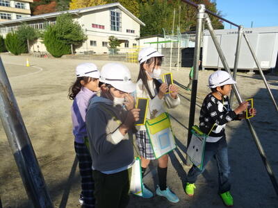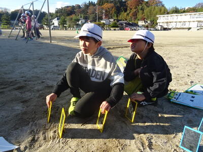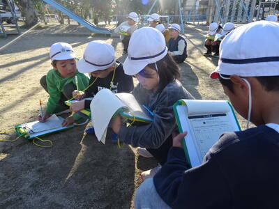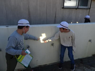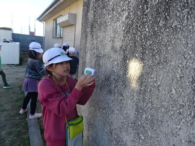 鏡で日光を反射させ、的(決めた場所)に当てます。鏡を1枚、2枚、3枚と増やし、光を重ねていったときの、明るさと温度を調べていました。