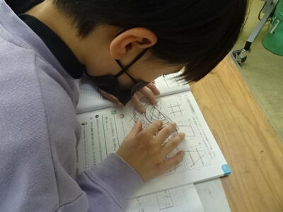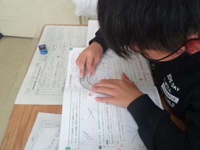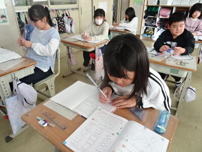 「ひし形」について学習しています。定規や分度器を図形にあて、その特徴を調べていました。