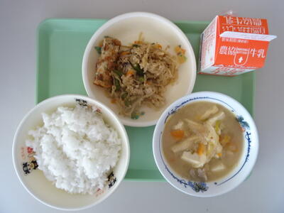 本日のメニューは、ごはん、牛乳、ちくわのいそべ揚げ、切りぼし大根のふくめ煮、ご汁 でした。