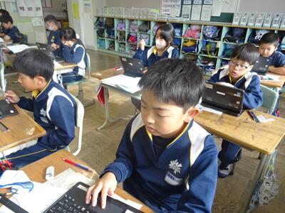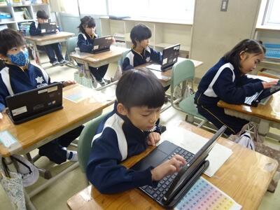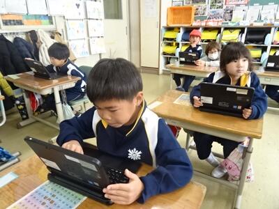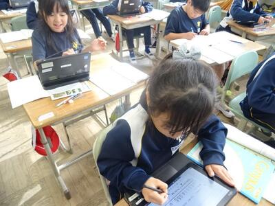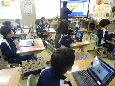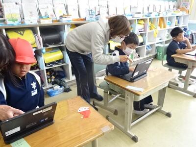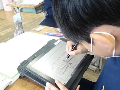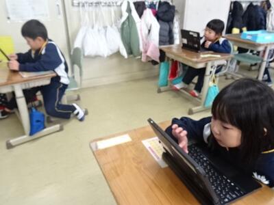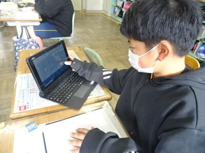 ICTサポーターの先生に操作の仕方を教わりながら、タブレットを使って学習です。「どちらがながい」や「なんばんめ」の学習のふり返りをしていました。
