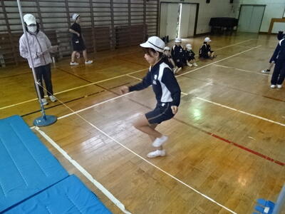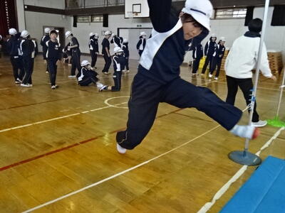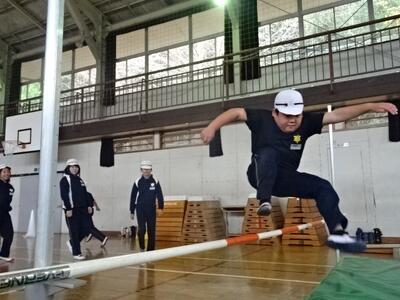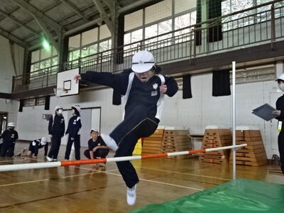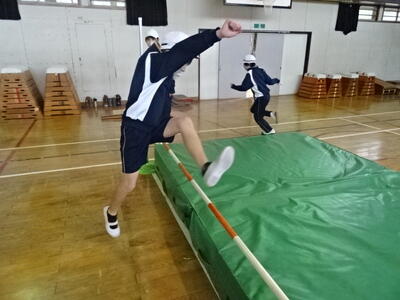 高跳びの学習です。片足で踏み切って、高く跳ぶことができるように練習していました。