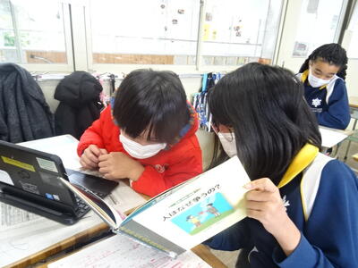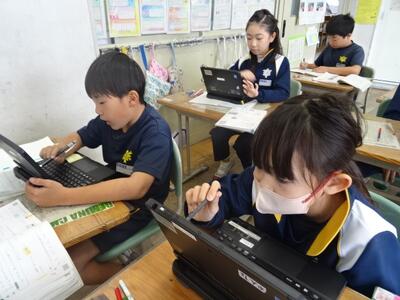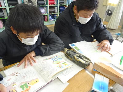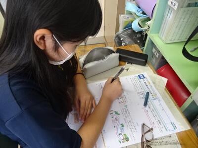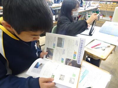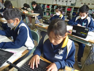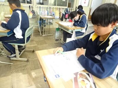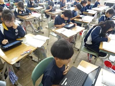 「世界の人々と手をつなぎ、平和を守るためにはどうしたらよいか」をテーマに、資料で調べながら自分の考えを作文に表していました。