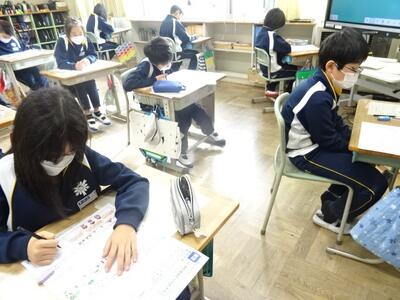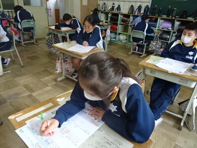 「単位量あたりの大きさ」のテストに取り組んでいます。じっくりと考えながら問題を解いていました。