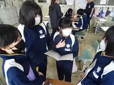 身の回りにあるミシンで縫われた布製品を探し、ミシン縫いのよさについて話し合っていました。