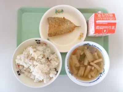 本日のメニューは、ごはん、ねぎの油みそ、牛乳、アジフライ、たぬき汁 でした。