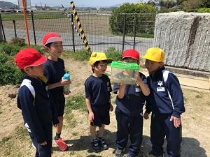 2019年4月23日 17時04分休み時間に虫探しをする低学年の子どもたちです。バッタを捕まえたようです。