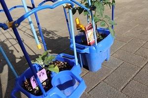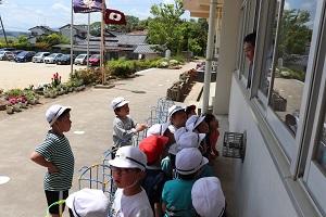 今日は2年生が野菜の苗のお世話。校長先生から「日がいっぱい当たるところに置くといいよ」とアドバイスをもらい、校長室の前に置かせてもらっていました。
