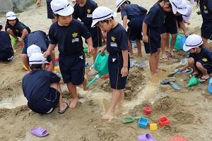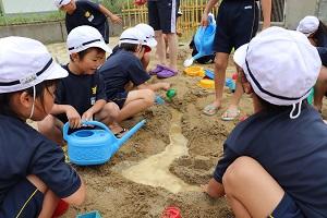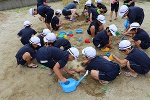 1年生では生活科の砂場遊びです。山をつくったり、水路をつくったり、トンネルを掘ったり・・・思い思いに想像を膨らませながら砂遊びを楽しんでいました。