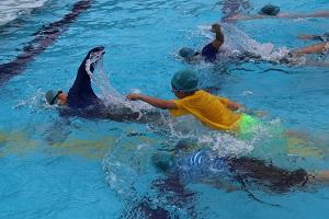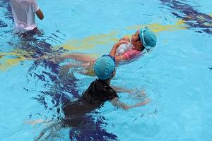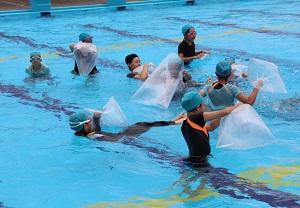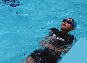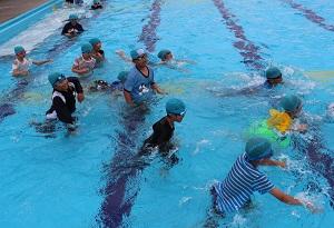 4年生では着衣水泳。「重い!」「動きづらい!」との感想。服を着て泳ぐことのたいへんさを実感。