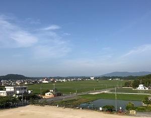 学校の周りの田んぼは、鮮やかな緑色になっています。